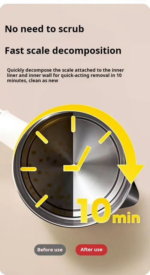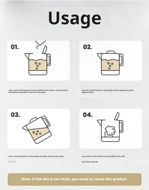1. Kettle/Coffee Maker: Add 1–2 sachets + warm water (0.5–1L). Soak 30–60 min, boil once if needed, then rinse 2–3 times.