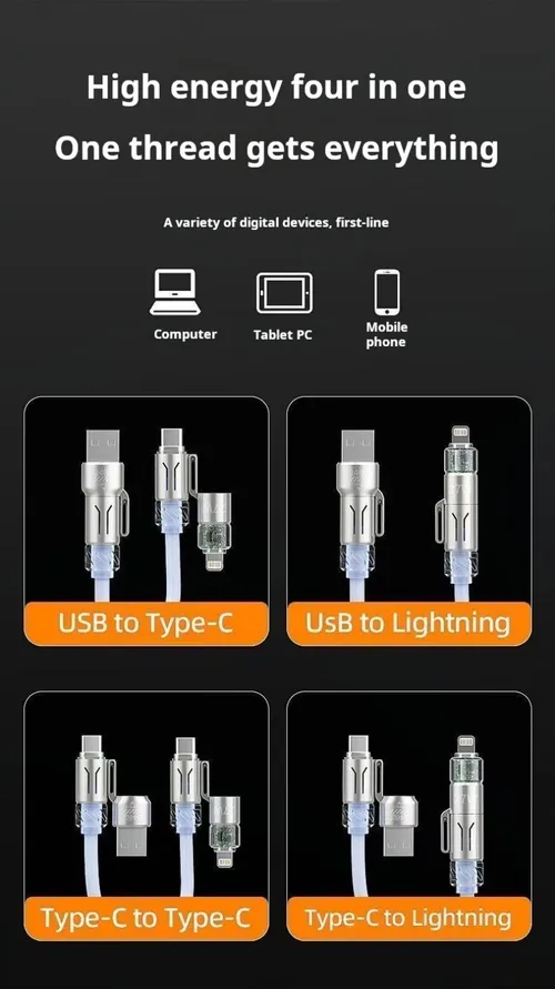 🔌 4-in-1 Flexible Cable: Compatible with USB-C, Lightning, Micro-USB, and standard USB devices.