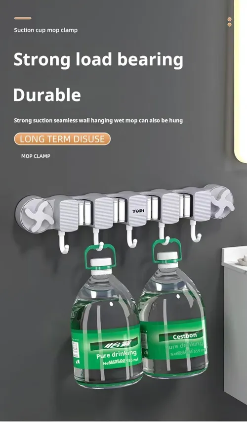 Product Details – Suction Cup Mop Holder with 4 Clips & 5 Hooks – Multifunctional Wall-Mounted Bathroom Storage Rack, No Drilling